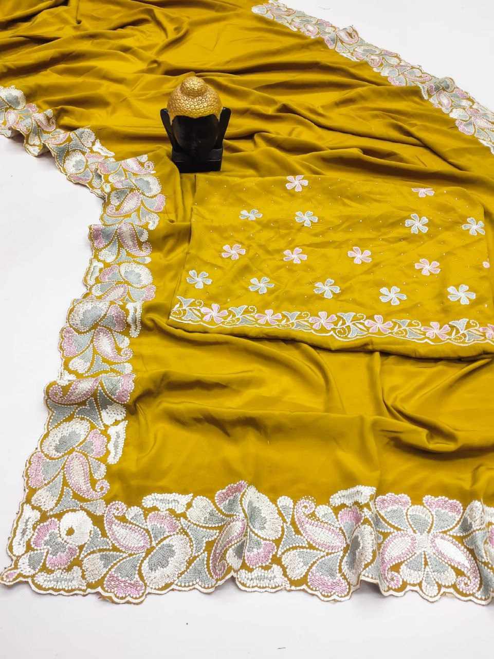 Pure D Natural Soft Satin saree with heavy Embroidery thread and heavy siroski work and cutwork borders