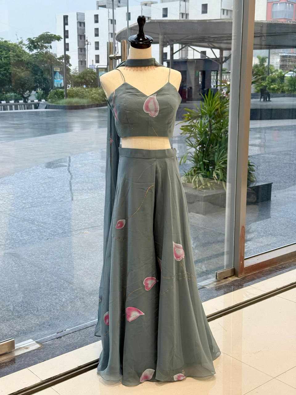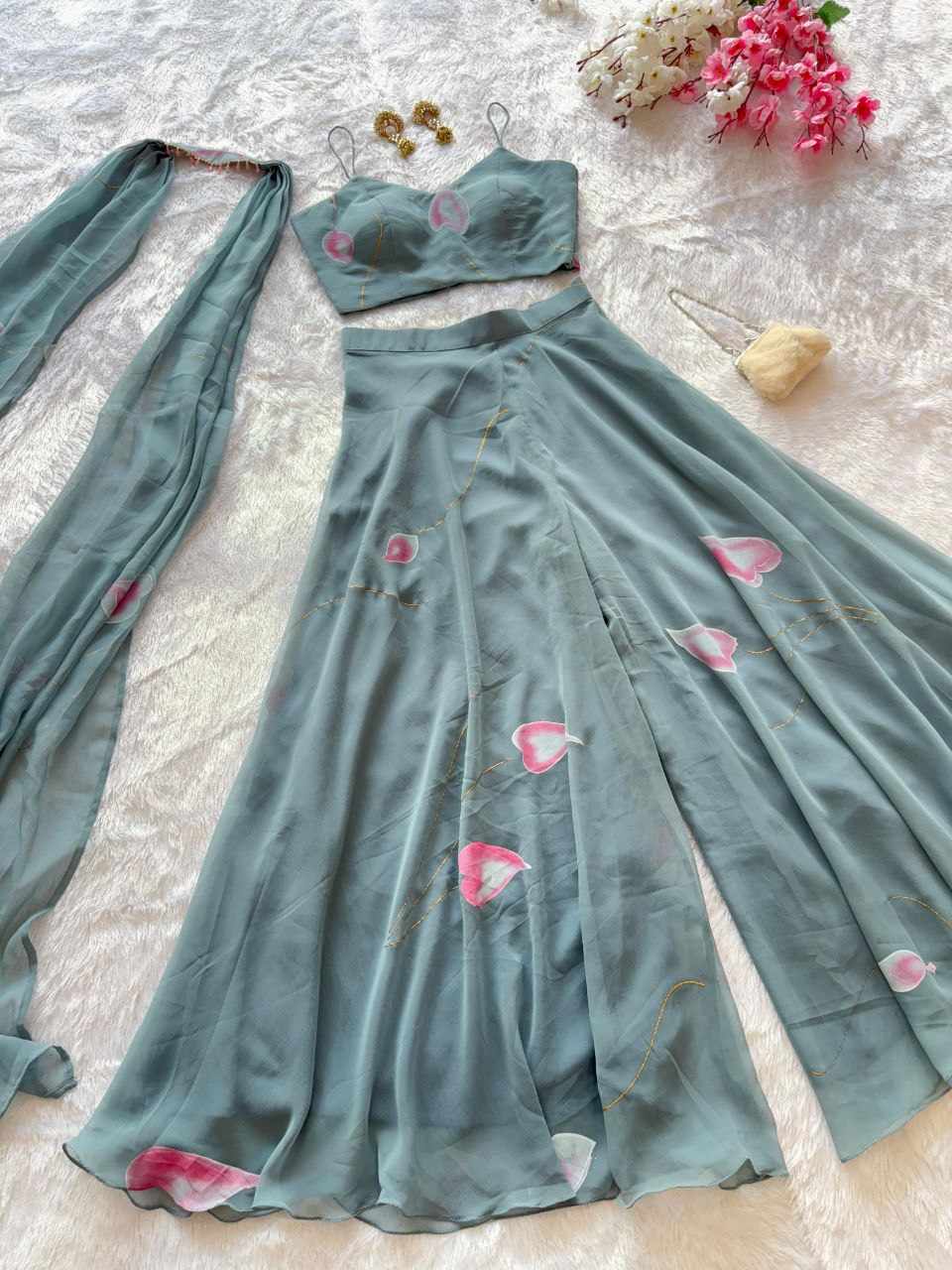 Dupatta – Pure Georgette hand-painted dupatta enhanced with a delicate moti lace border for a graceful finish