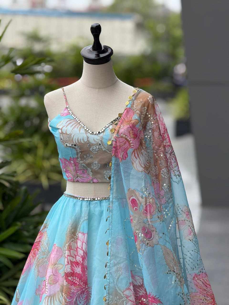 Lehenga – Pure organza digital printed lehenga with a grand 8-meter flair. Comes with canvas patta and adjustable waist dori for a perfect fit